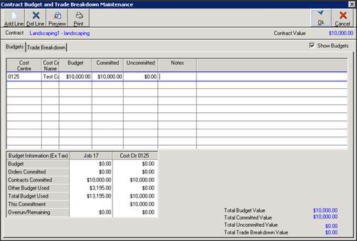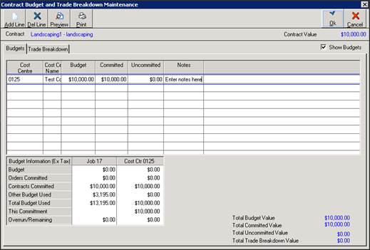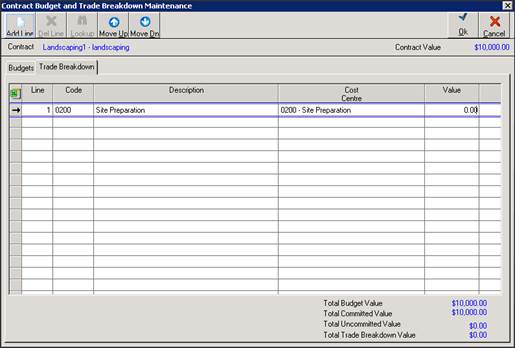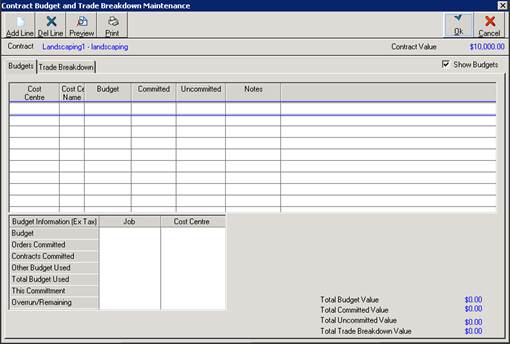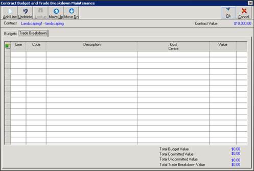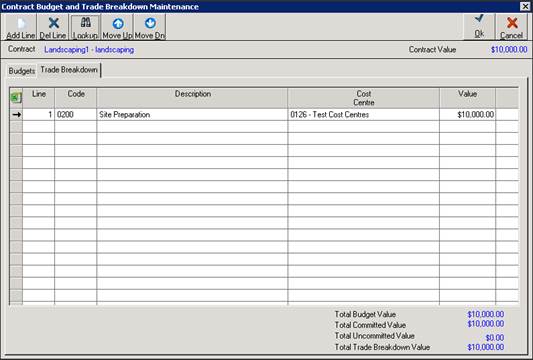 3. There are 2 tabs displayed here – the Budget tab is where the user will allocate the Contract Value against the Job/Cost Centre Budget. The Trade Breakdown tab is used to add the Trade lines to the Progress Claim Certificate.