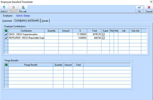 Fig 4 – Standard Timesheet maintenance window Contributions TAB