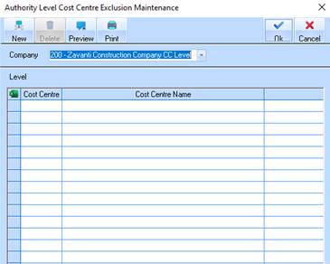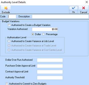 11. Click on the Exclude button in the top left hand corner. This option allows the user to ‘exclude’ certain cost centres for selected jobs to be excluded from any of the Authority level checking, by passing the rules set for the selected Level