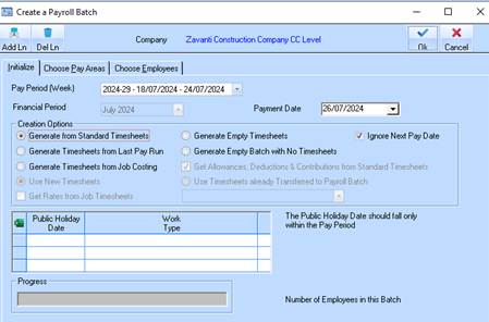 Initialisation is the first step required to run a batch of pays. It involves the actual creation of the batch for processing. During this phase, selection of employees to be paid takes place. In addition, there are several attributes in the batch, which can be specified by the user, offering flexibility that tailors the system's behaviour to the operation required.
