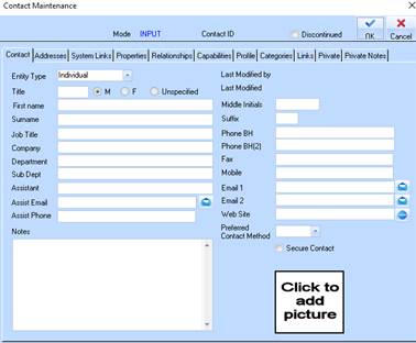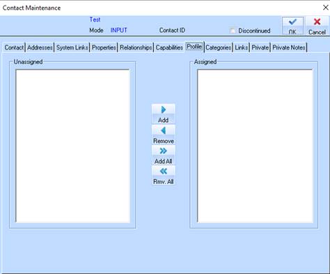 16. The Profile window allows you to assign the contact a Profile. This is used as a search criterion for the contact.