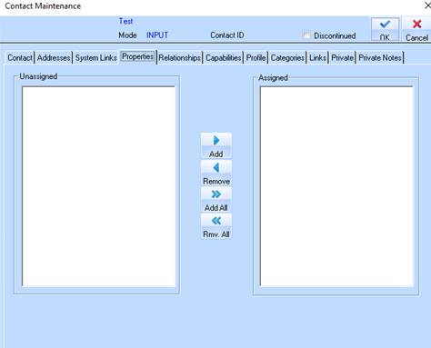 11. This window allows you to assign Property codes to the contact. Select a Property from the unassigned list where it exists and press the Add button. The value will now appear in the Assigned list.