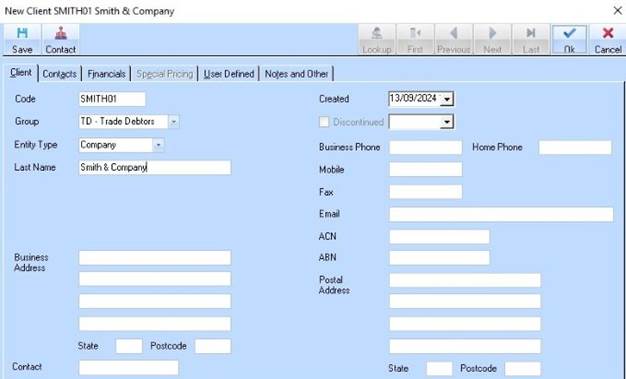 5. To create a new contact for the Debtor, select the New button. The following dialogue box will be displayed.