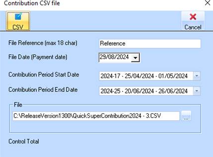 3. Contribution CSV file creation parameters - the user is prompted to enter the parameters required in order to generate the formatted data file for nominated Clearing Houses for processing using a clearing house ‘standard’ formatted CSV file.