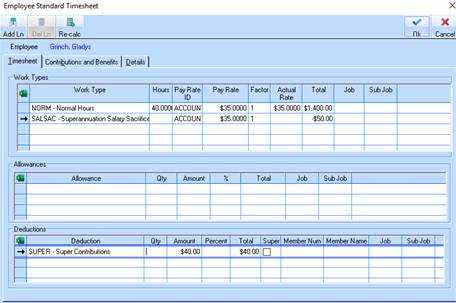 The following Standard timesheet shows the Additional Employer Superannuation deduction with the Employees specific Member Number and Member Name (See Additional Superannuation Deduction)