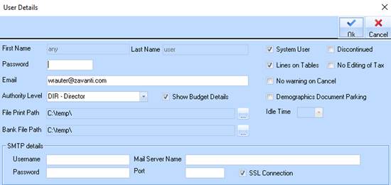 An additional facility has been added to allow bulk emailing of payslips and annual pay certificates from the payroll module using the SMTP protocol. This needs to be set up for each authorised user in Systems Administration before use. The fields for “SMTP details” need to be added for each user.