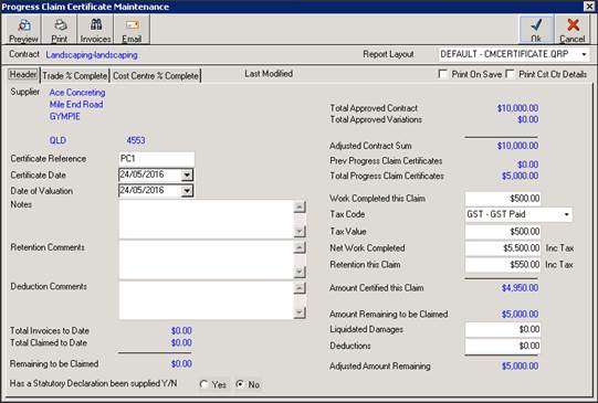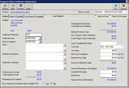 When creating Progress Claim Certificates variations can also be claimed by percentage or dollar value complete similarly to the Trades. Approved variations will automatically be included. However, Unapproved Variations are optional. This is maintained in the Contract Management defaults.