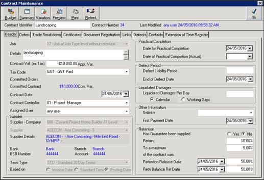 16. Retention has been calculated based on the percentages set on the contract header