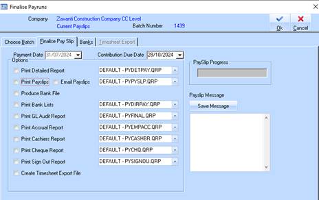 10. When the user is satisfied that the batch is correct, print any other reports, payslips (if required), bank file creation etc.