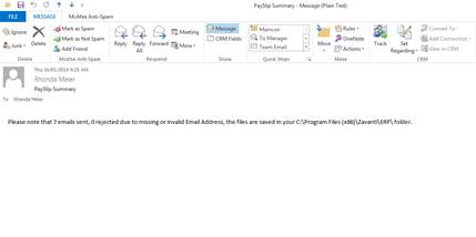 19. This is sample of the email sent to the user confirming number of email sent or rejected. It also shows that copies of the pdf payslips are saved in the ERP folder.