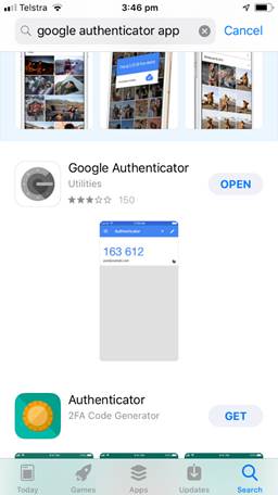 You must download the Google Authenticator app for your mobile device from the relevant app store. This is required by the ATO to enable 2 factor authentication for all files submitted to the ATO. The app generates a secure random 6 figure code from a link read by your phone on the screen. Entry of this code is required to proceed.