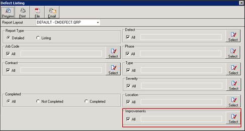 A filter "Improvement" is available in the Contract Management Defect Listing. Previously, defects and improvement levels were recorded against Contracts but were not able to be selected on the Defect Listing. Users simply need to uncheck the “All” tick box to bring up an Improvement Lookup window. Select the appropriate Improvements, press OK and Print to produce the report filtered by Improvements.