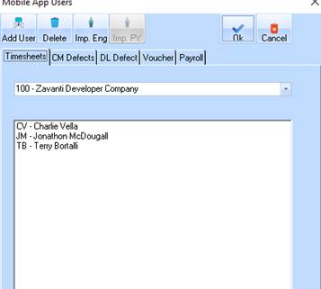This will show you a list of current users (engineers) by entity. You can add or delete users from this screen to allow access to each of the mobile app function by selection of each TAB
