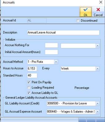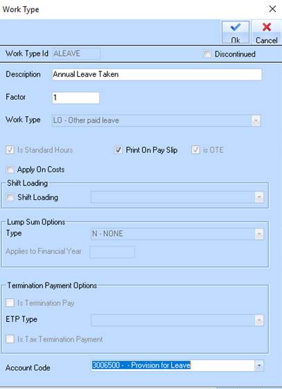 3. If you select this option, automatic recording, you must set up the Accruals Work Types to Accrue to General Ledger – see below – select ‘Accrue Liability to GL’ then enter relevant accounts for posting.