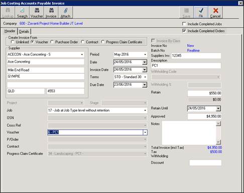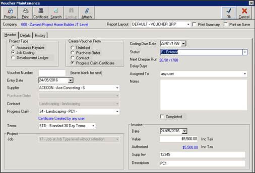 3. Select the Supplier and the Progress Claim Certificate. Assign to the Project Manager and enter the supplier invoice number and date. Click on OK and pass the Project Manager for Approval.