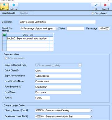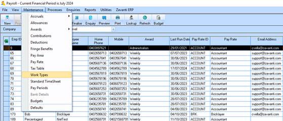 1. In the Payroll Module, create a new 'Work Type' from the Maintenance menu selection on the front window (e.g. Code – SALSAC, Description - Salary Sacrifice)