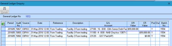 10. A Payment, from the NON Facility account for $99,000, has been processed to the selected ‘Trading Bank Account’, with the corresponding Journals above