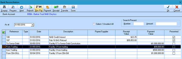In this example we are moving $ 99,000 into the Senior Debt – Construction Facility, FROM the Trading bank account (non- funding facility)