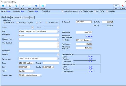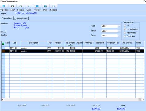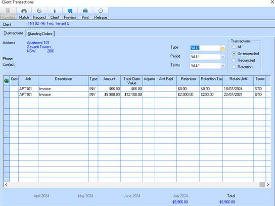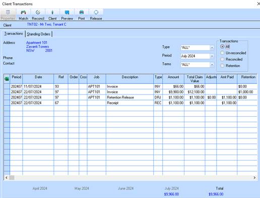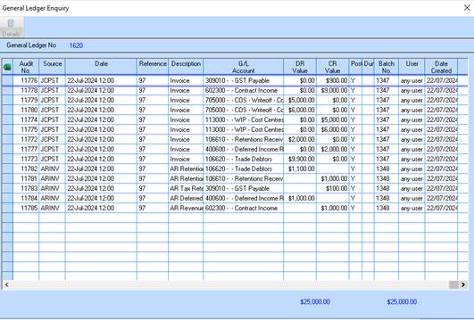 3. Retention is still displayed in the invoice header. Retention tax is now also displayed in the client enquiry window. See below sample for general journals showing the retention held transactions