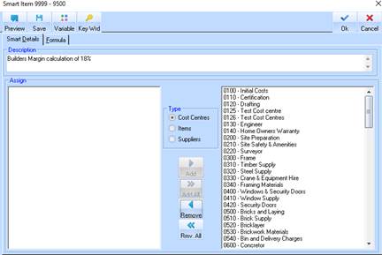 8. After you have identified the basis for the Smart Item the available options will be in the left hand (Assign) column. You can then move all or individual options to the right hand column. These will then be used to check the estimate for application of the Smart Item.