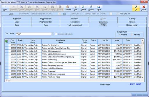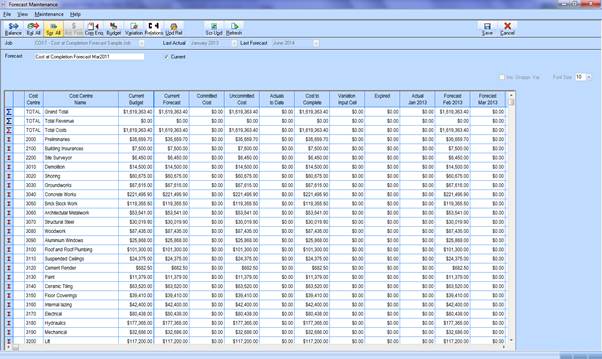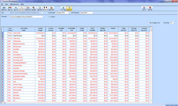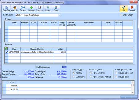 •Sample data / screen ... we have a Cost Centre for scaffolding which has a budget value of 14,500 but we re-project the cost at completion for scaffolding to be at 20,000 and have updated the forecast value accordingly.