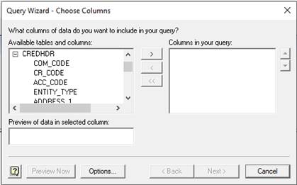 8. A list of the Columns in this table will appear. To select a column (and thus have the appropriate data appear on your Excel spreadsheet) highlight the column and press the arrow pointing to the right (>) to shift the column into the window on the right.