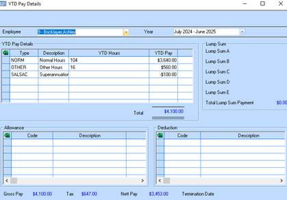 The Year to Date Pay Details enquiry function allows you to display all pay, allowance and contribution data for the current financial year for a selected employee.