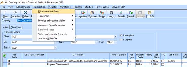 1. In the Job Costing Module select Transactions/Disbursement Entry
