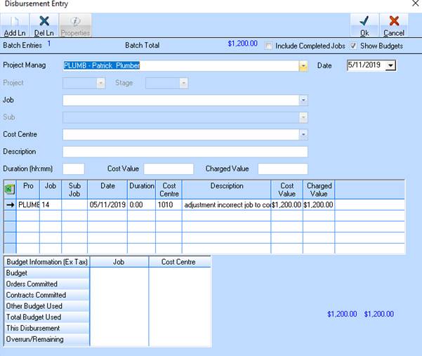 3. Select the Job and Cost for correct job, enter a description, 0 in duration, Positive value in Cost and same value in Charged