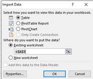 15. Select the Cell in the spreadsheet where the information is to appear, and press OK. For advanced users, you can also select if you wish to create a Pivot table from the data you are extracting