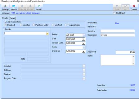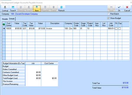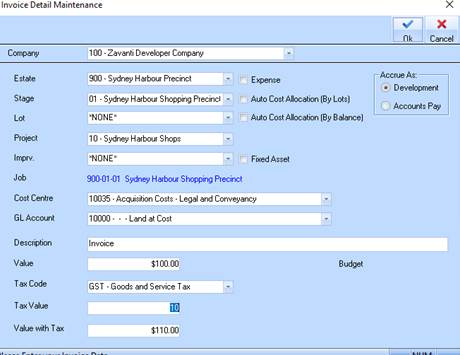 The invoice entry function allows you to enter costs received from suppliers of capital development costs and overhead services. The specialised nature of the allocation of costs to companies, estates, stages and projects necessitates the existence of this function in the Development Ledger as opposed to the Accounts Payable Ledger. As well as entering costs that are associated with developments you can also enter costs that are simply dissected to the accounts payable module.