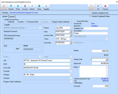 When entering a job related AP invoice linked to Purchase Order, the system calculates the amount of retention to be held based on the following: