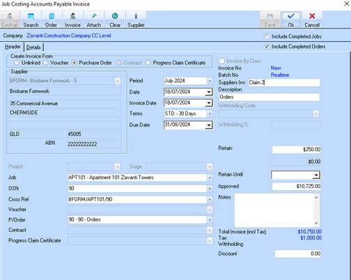 In the example below the invoice has been linked to a Purchase Order for $20,000. The following invoice is the first claim against this purchase order and is for $5,000. The details tab on the invoice has been adjusted accordingly, and the following calculation is displayed in the header.