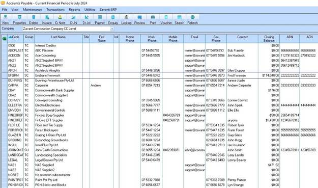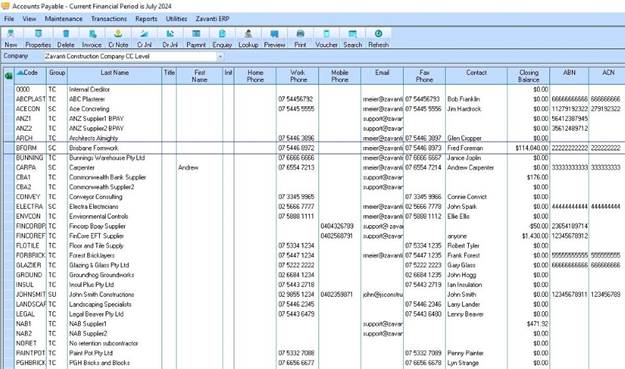 When first logging into the Accounts Payable module, users are presented with the main screen displaying a list of all suppliers. You can display the closing balance for suppliers on the right hand side of the screen by checking the “Show Closing Balance” option on the View menu. The figure will be calculated up to the current date only and will not take into account any future transactions.
