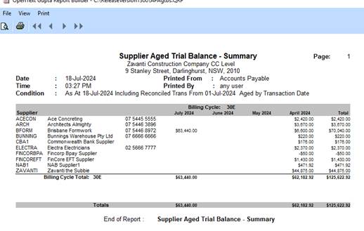 While the Aged Trial Balance report reflects the payable amounts of invoices, it does not include Retained values and no longer displays any retention amounts. These amounts are now held in different General Ledger control accounts. The user should now run the Retention Listings.