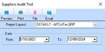 1. To generate the report, select a menu path of Reports Ø Audit Trail. The following dialogue box will be displayed: