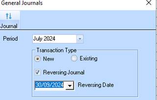 •"Reversing Journal" tick box - ticking this signals that reverse journals should be created as the user enters new journals