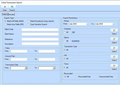 1. Select a menu path of Utilities Ø Client Transaction Search. The following window will be displayed: