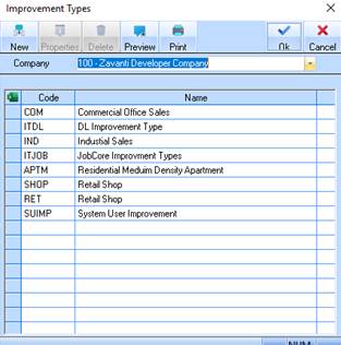 Improvement Types may be used to define different types of construction developments i.e. a townhouse within a townhouse project, or differing sizes of houses, e.g. small, large, display homes, etc. They are also used for subtotalling improvements and as selection criteria on the improvement listing.
