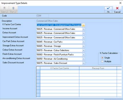 If you have decided to use Multi Cost Recoupment style for an estate it is here in the improvement type maintenance that you will set up your matrix of capital accounts to cost of sales (recoupment) accounts.