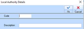 Each Lot in the system will need to be allocated to a local authority when you are maintaining it. The following facility allows you to maintain the local authority code and names that will be allocated to the lot as you maintain it.