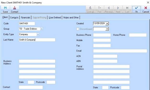 2. Enter a value into the Code field. When adding a new client, the debtor code field must only have characters within the range of 0-9, and A-Z (caps and non-caps).