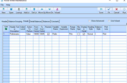 33. The database has been setup to reflect all preliminary cost codes between 10130 and 10045. Therefore, for this detail line of the report, we will call this detail line Preliminaries.