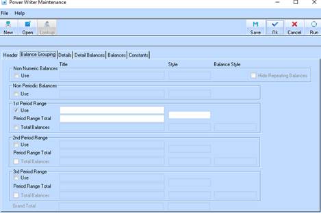 You must have a tick in the period range box in the Balance Grouping tab, to be able to access balances for those periods in the Balances tab. |