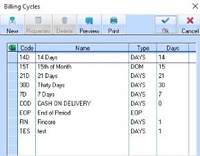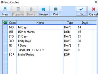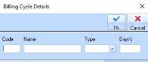 1. Select a Menu path of Maintenance Ø Billing Cycles. The following dialogue box will be displayed: