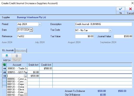 Journal entries must comprise Credit and Debit amounts of equal value. If entries are not equal, the “Out of Balance” field in the Balances Display area of the window will display the amount that the journal is out by. |