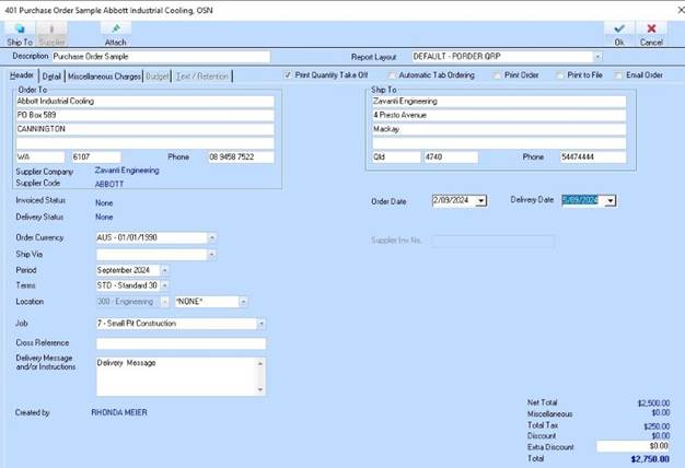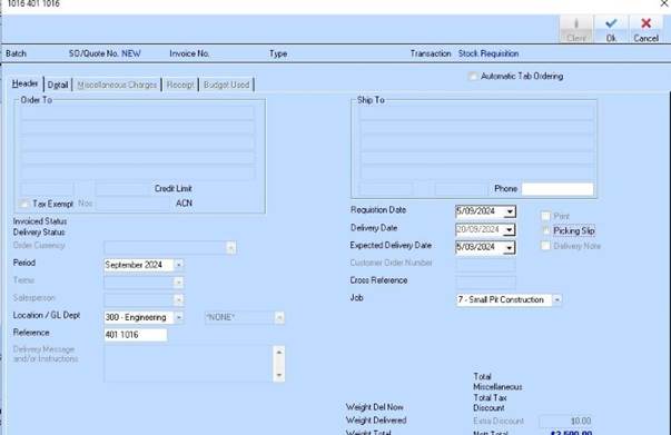 5. Change ‘Requisition Date’ only (Delivery and Expected Delivery are only relevant to a Sales Order.