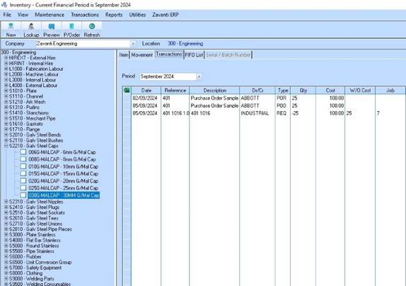 8. The Item Transactions now show a POD (Purchase Order Delivery) delivering the stock and an REQ (Job Stock Requisition) removing the stock on hand and allocating it to the Job