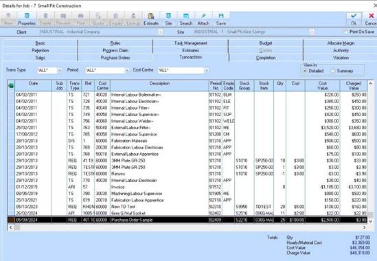 9. The Job Properties/Transactions tab displays the requisition as costs to the job