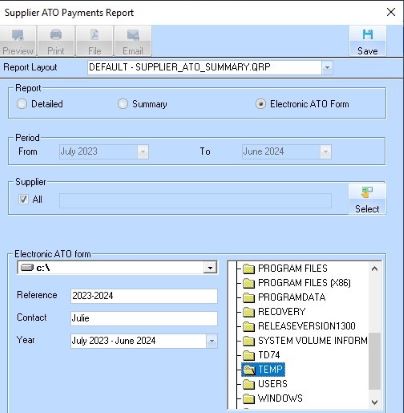 This information is maintained in Zavanti Company and Supplier record maintenance. Please ensure this data is complete for ALL suppliers to be reported, before processing the ATO Electronic file option